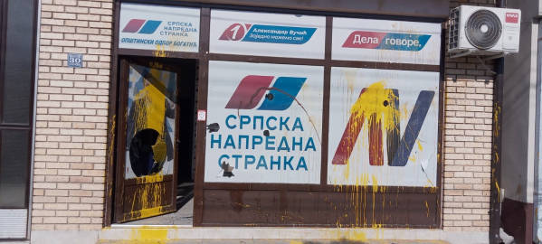У својој синоћњој акцији за почетак јајима, фарбом, потом каменицама и сличним тешким металним предметима начинили су штету како на самом локалу који је у закупу ОО СНС Богатић, тако и на приватној кући породице која нам је издала локал у закуп.